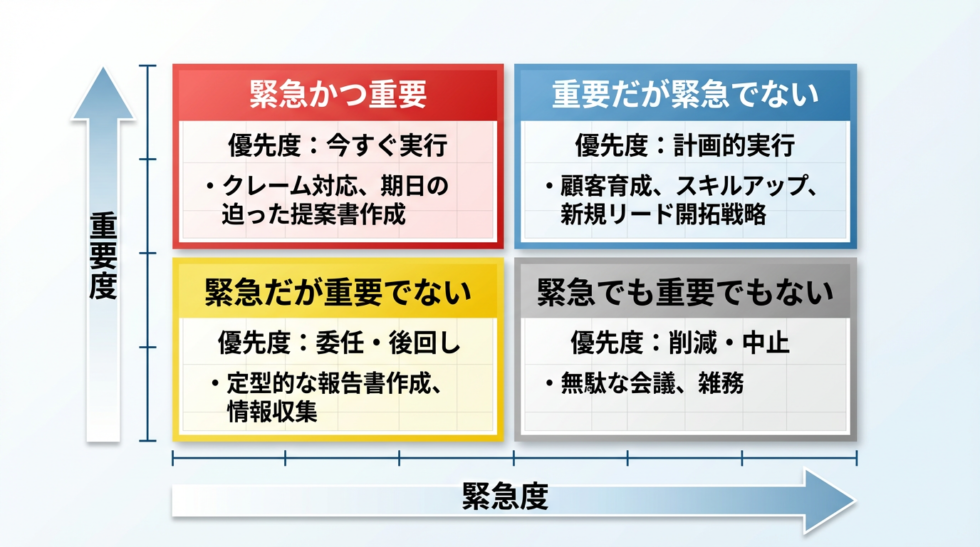 日々の膨大なタスクに追われる営業担当者にとって、タスク管理と優先順位付けは効率化の要です。まずは、タスクを「重要度」と「緊急度」で分類する「アイゼンハワーマトリクス」を活用し、取り組むべき順序を明確にしましょう。